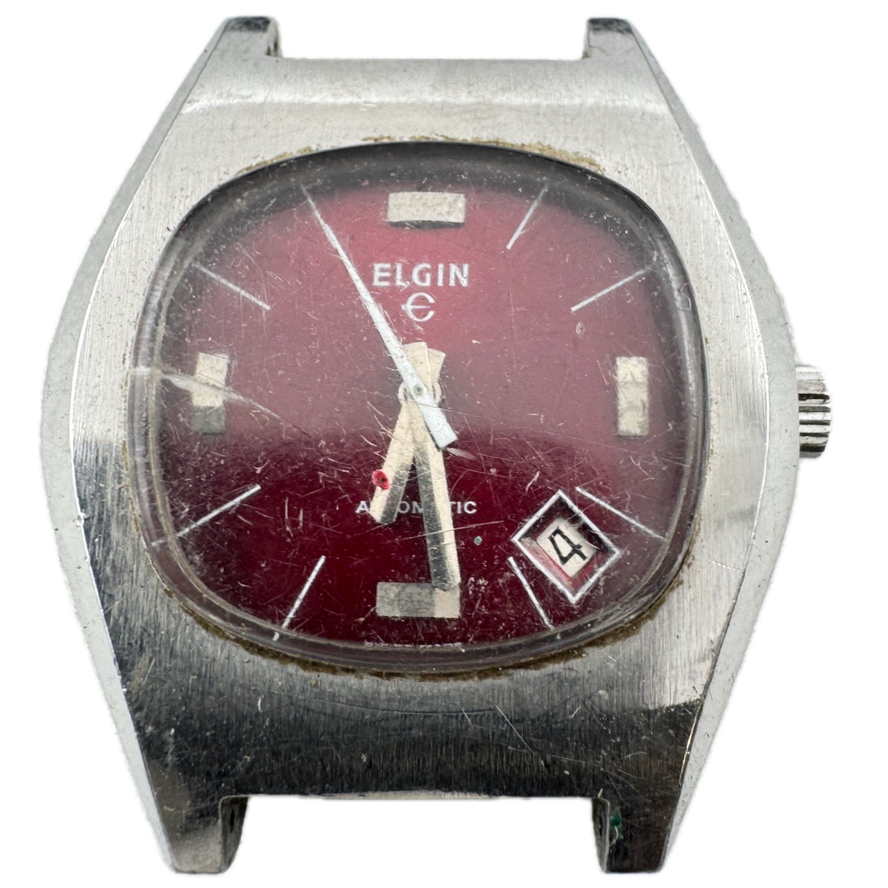 Vintage Elgin Red Sunburst Date Men's Automatic Wristwatch 333 Swiss Steel