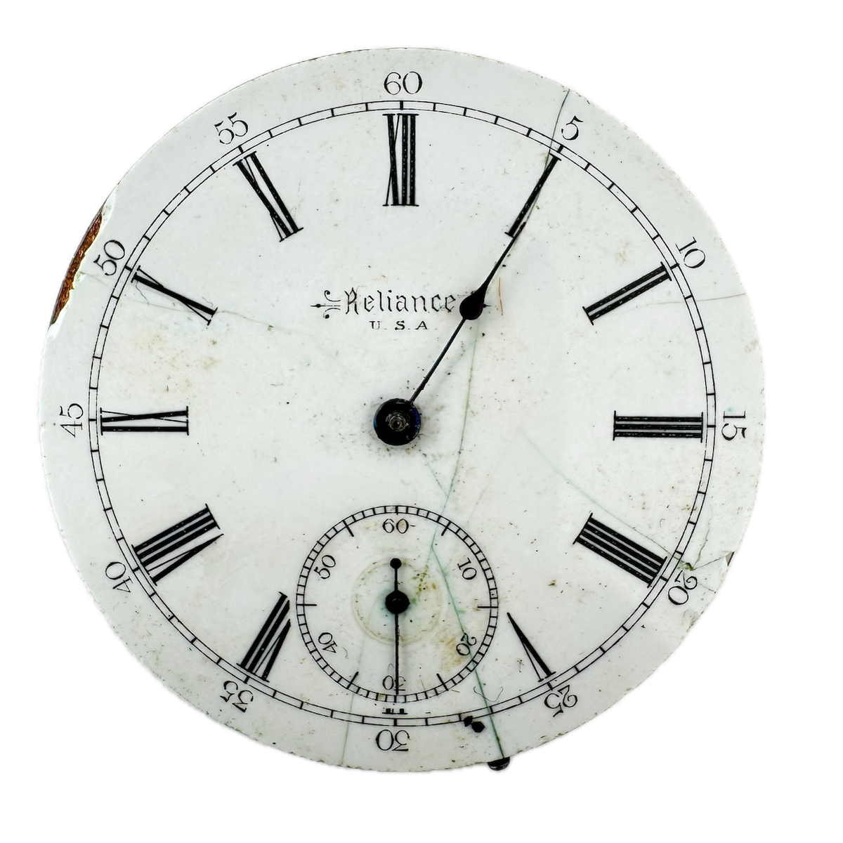 Ok, overall condition for its age. Not running, the balance complete is good though. The dial has hairline cracks on it. There is light discoloration on the dial. It is missing the minute hand. Extremely weak Amp.