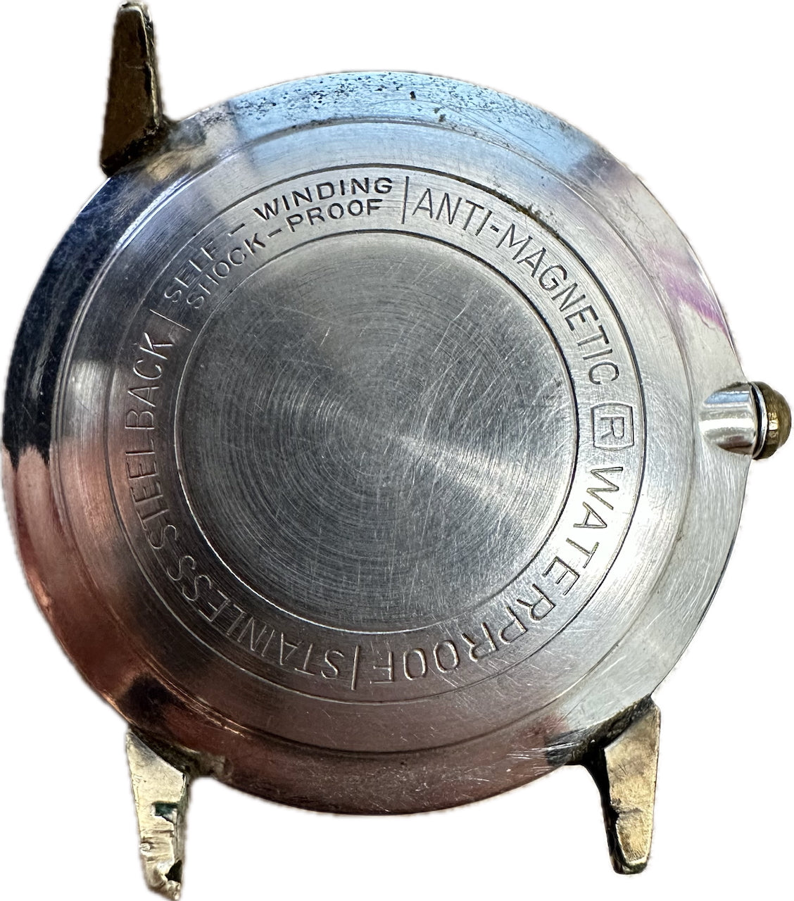 Fair, overall condition for its age. Not running as it is for parts. There is plating wear through and scratches on the case. There are scratches on the crystal. There are scratches on the dial. Broken lug at 5 o clock.